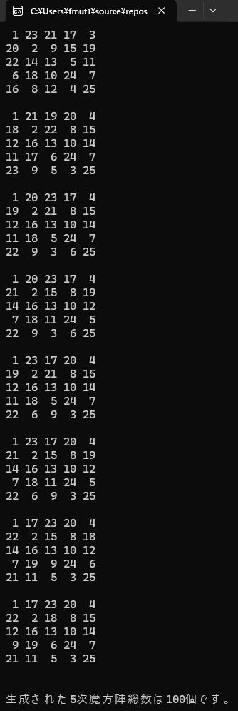 生成された5次魔方陣総数は100個です。