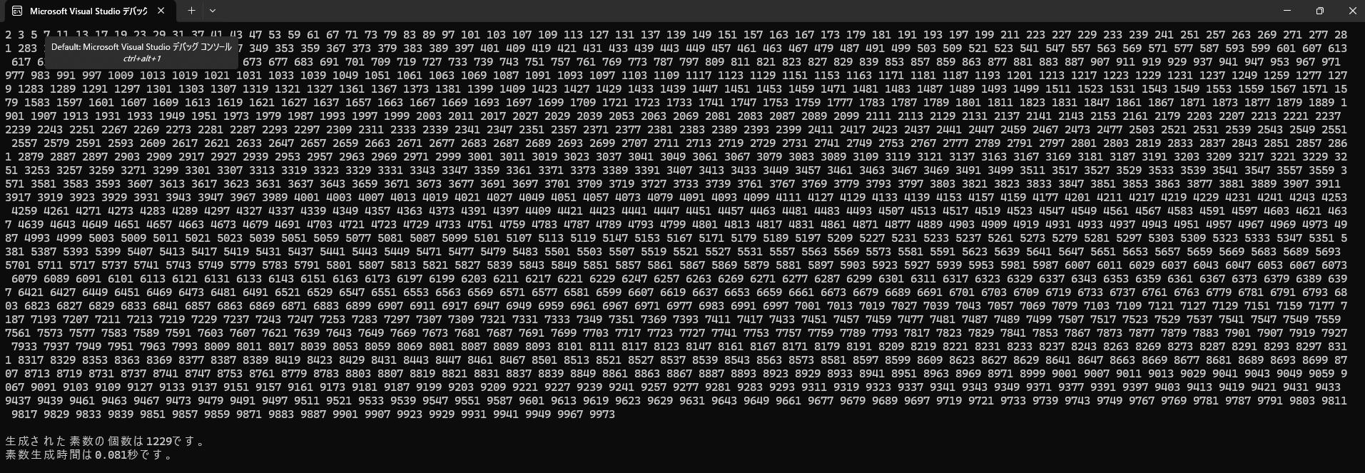 cout << "生成された素数の個数は" << cn << "です。" << endl;