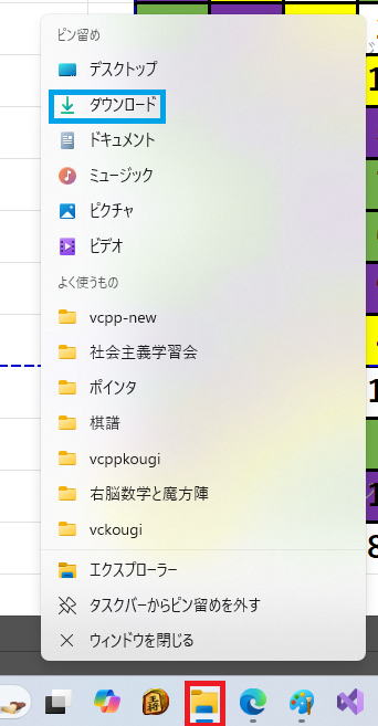 エクスプローラーをクリックしてダウンロードを選びます。