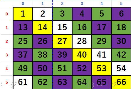 系列1 a[0][3] → a[1][4] → a[2][5] → a[3][0] → a[4][1] → a[5][2] 一般化すると a[i][y]