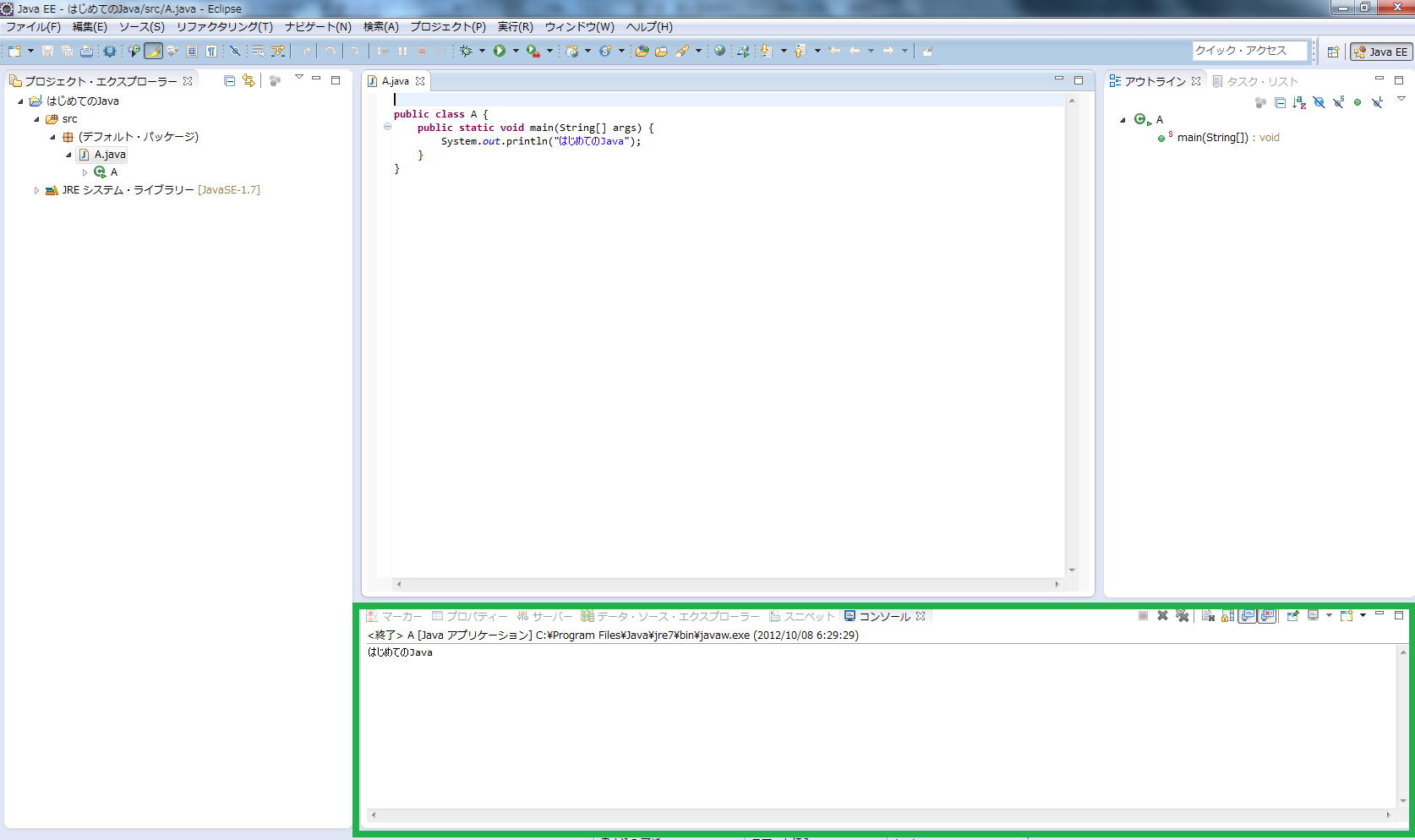 そして、C:\java\d1\はじめてのJava\src>java Aとしてからエンターすると