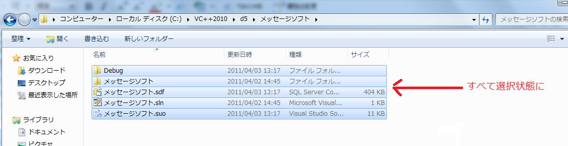 先ほどと同手順ですべてを選択状態にする(Debugでクリック→Shiftキーを押しながらメッセージソフト.suoをクリック)。