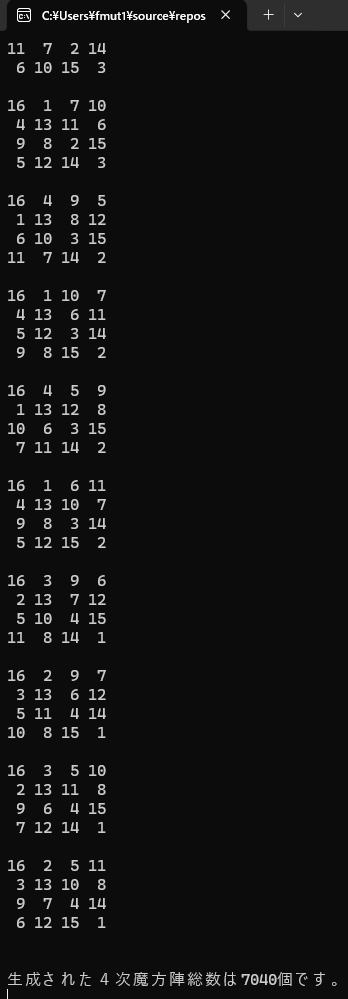 cout << endl << "生成された4次魔方陣総数は" << cn << "個です。" << endl;//←2026年3月19日訂正