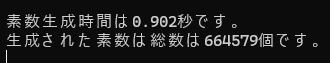 cout << "素数生成時間は" << (double)(ow - hj) / CLOCKS_PER_SEC << "秒です。" << endl;