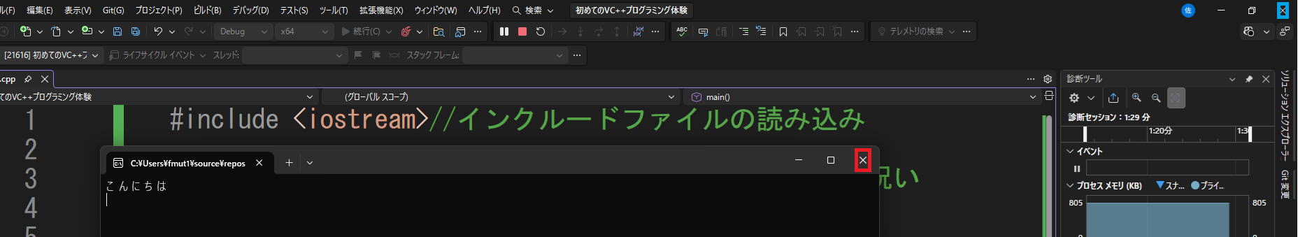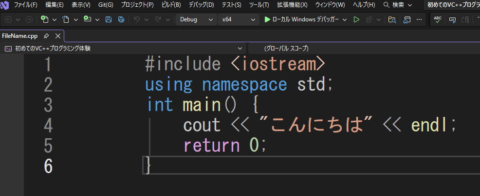 「こんにちは」を表示させた『初めてのVC++プログラミング体験』の場合どうなっているか、