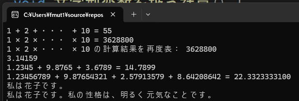 cout << 文字型変数 << endl;//文字型変数の中身"私は花子です。私の性格は、明るく元気なことです。"をコンソール画面に表示