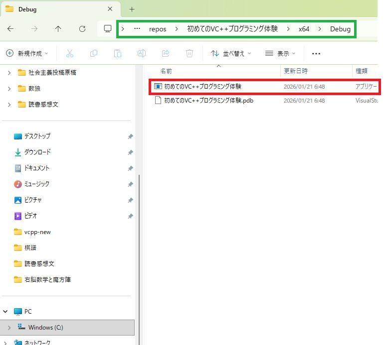 C:\Users\推測されるフォルダ名\source\repos\初めてのVC++プログラミング体験\x64\Debug