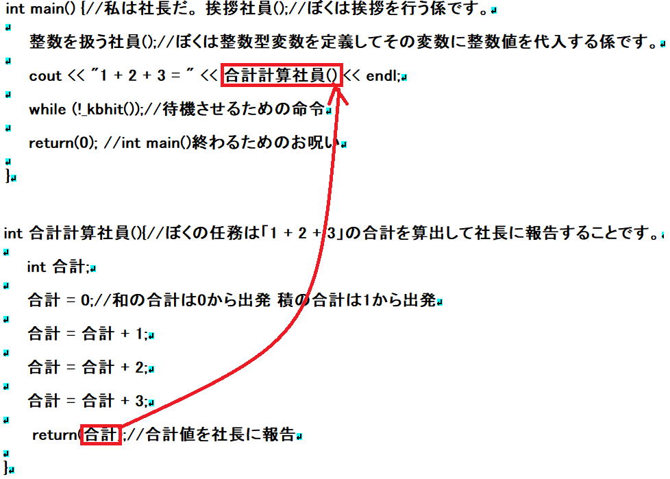 int 合計計算社員();//ぼくの任務は「1 + 2 + 3」の合計を算出して社長に報告することです。