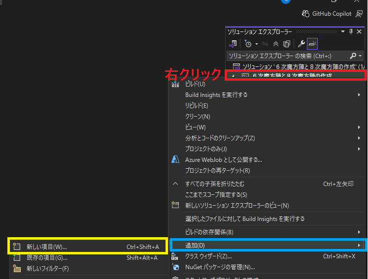 6次魔方陣と8次魔方陣の作成で右クリック→追加→新しい項目