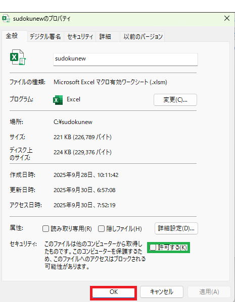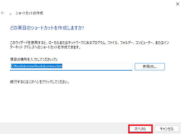 C:\sudokunew\sudokunew.xlsmと入力して、次へをクリックします。