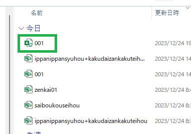 ダウンロードフォルダに戻り001をダブルクリックするとエクセルが起動します。