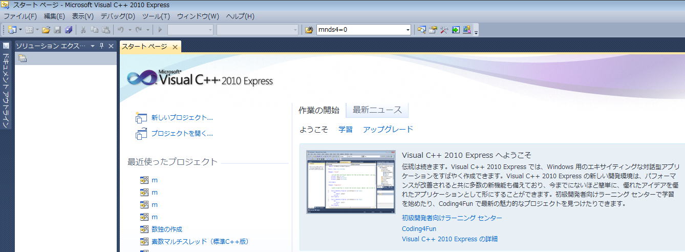 これをクリックするとVisual C++ 2010 Expressが起動します。