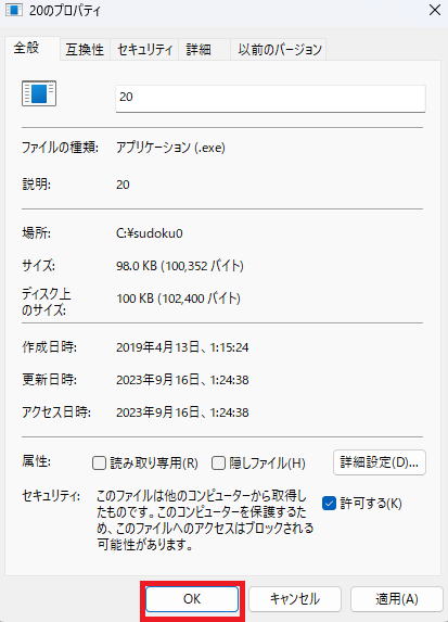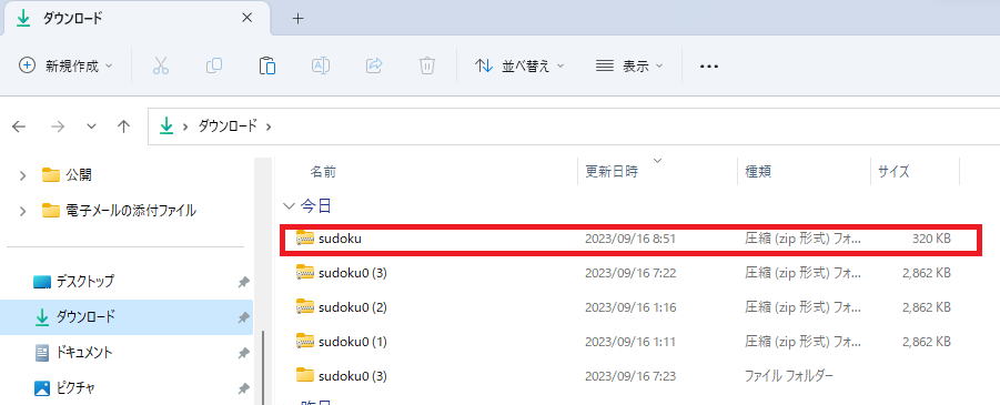 すると圧縮ファイルが解凍され、sudokuというフォルダがC:\上に展開されます。