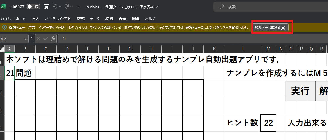 実行ボタンをクリックして数独ができればブロックが外されたことが確認できます。