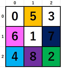 a[3][3]の添え字のところに具体的な数字をいれて動きを見てみましょう。