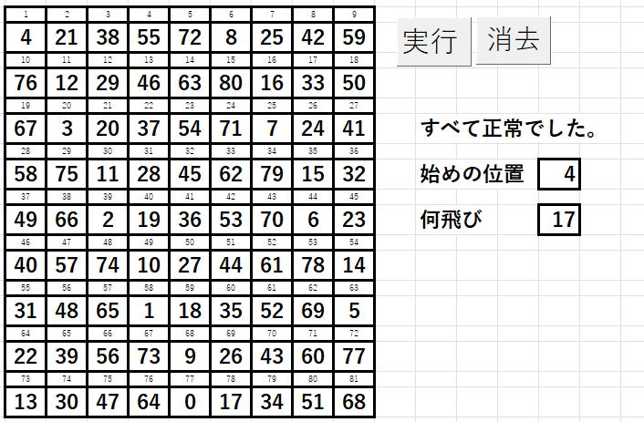 始まる数と飛び方(いくつ飛ぶか)を指定して81回繰り返すと、