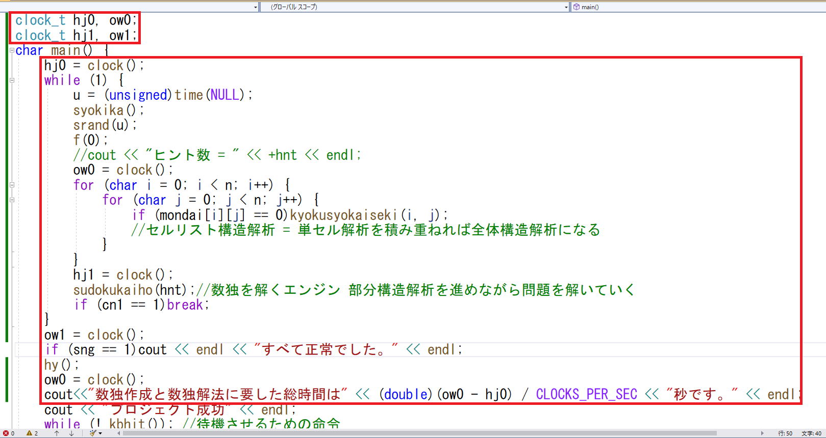 cout << "数独作成時間は" << (double)(ow0 - hj0) / CLOCKS_PER_SEC